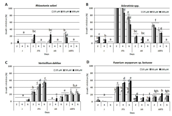 Effect of compounds on the growth of horticultural crop pathogens (A) R. solani, (B) Sclerotinia spp., (C) V. dahliae and (D) F. oxysporum. Culture medium was amended with increasing concentrations of molecules (from 25 to 100 µM) on the basis of the species; values are reported as inhibition percentage as compared to the control (DMSO amended cultures) ± S.D. Different letters indicate statistically significant differences (p < 0.05).