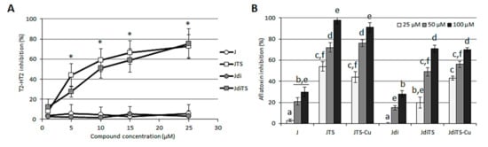 Effect of compounds on the mycotoxin production in two cereals pathogenic fungi. Toxins T-2 and HT-2 were quantified in F. sporotrichioides cultures exposed to increasing concentration (from 1 to 25 µM) of J, JTS, Jdi and JdiTS compounds (A). Aflatoxins were quantified in A. flavus cultures exposed to increasing concentration (from 25 to 100 µM) of all the compounds (B). Values are reported as inhibition percentage as compared to the control (DMSO amended cultures) ± S.D. Asterisks or different letters indicate statistically significant differences (p < 0.05).