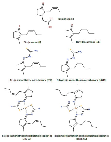 Schematic representation of the structures of Jasmonic acid (JA) derivatives (J, Jdi), their thiosemicarbazones (JTS, JdiTS), and their copper complexes (JTS-Cu, JdiTS-Cu).