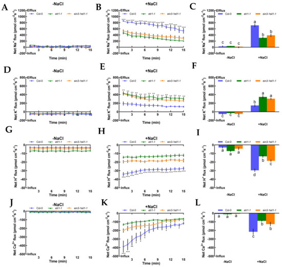 Effects of short-term NaCl stress (100 mM, 12 h) on the steady-state Na+, K+, H+, and Ca2+ flux kinetics in Col-0, etr1-1, and ein3-1eil1-1 roots. Young roots were cultured in MS medium without (−NaCl) or with NaCl (100 mM) for 12 h. Steady-state Na+ (A‒C), K+ (D‒F), H+ (G‒I), and Ca2+ (J‒L) flux kinetics were recorded at the meristem root zones (500 μm from the root apex) in salt-untreated (left panels) or salt-treated roots (middle panels) for 15 min (compared to control groups, * p < 0.05, ** p < 0.01, and *** p < 0.001). Columns in the right panels represent the mean of each net ion flux at all salt-untreated (‒NaCl, without NaCl, the same below) and salt-treated (+NaCl, with NaCl, the same below) time points and the letters a, b, c, and d denote significant differences between strains (p < 0.05). Each point or column (± SD) represents the mean of five to six individual plants.