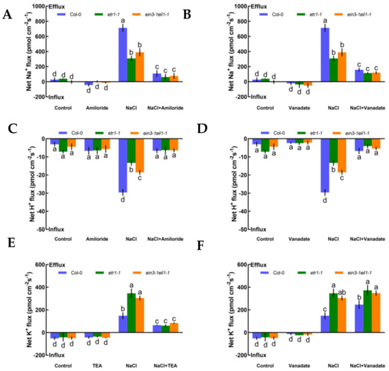 The pharmacological effects of several PM channel inhibitors were tested in salt-treated Arabidopsis seedlings, i.e., amiloride (a PM Na+/H+ antiporter blocker, 50 μM, Sigma-Aldrich, St. Louis, MO, USA) and sodium orthovanadate (a specific inhibitor of the PM H+-ATPase, 500 μM, Sigma-Aldrich, St. Louis, MO, USA) were used to inhibit the PM Na+/H+ antiport system, while tetraethylammonium chloride (TEA, a typical K+ channel inhibitor, 50 μM, Sigma-Aldrich, St. Louis, MO, USA) was used to block the salt-induced K+ efflux [6,7,10].
