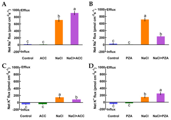 Effects of 1-aminocyclopropanecarboxylic acid (ACC, 10 μM) and pyrazinamide (PZA, 100 μM) on the steady-state Na+ and K+ flux kinetics of Col-0 roots under short-term NaCl stress (100 mM, 12 h). Roots cultured in MS medium were untreated or subjected to short-term NaCl stress (100 mM, 12 h) in the absence or presence of ACC (10 μM). For the pharmacological inhibitor experiments, MS-cultured roots were untreated or stressed by NaCl for 12 h, then subjected to PZA (100 μM) for 30 min prior to measurement of flux kinetics. Salt-elicited Na+ (A,B) and K+ (C,D) flux kinetics were recorded at the meristem root zones (500 μm from the root apex) in the absence and presence of ACC or PZA. Each column (± SD) represents the mean of five to six individual plants and the letters a, b, and c denote significant differences between different treatments (p < 0.05).