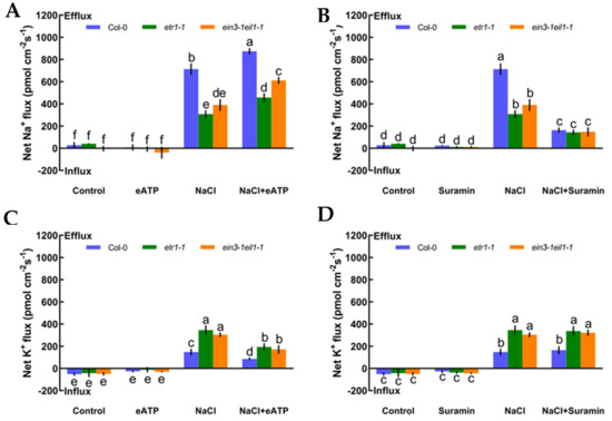 As described in Figure 4, we also measured whether eATP could maintain K+/Na+ homeostasis and interact with ethylene in salt-treated Col-0, etr1-1, and ein3-1eil1-1. First, we confirmed that eATP (300 μM) and suramin (an inhibitor of eATP, 300 μM) had no clear influences on ionic homeostasis in no-NaCl-treated Arabidopsis (Figure 5A–D). However, eATP enhanced the steady-state Na+ flux profiles in salinized Col-0, etr1-1, and ein3-1eil1-1. Furthermore, the enhancement of Na+ flux in Col-0 was 1.9-fold higher than that of etr1-1 and 1.4-fold higher than that of ein3-1eil1-1 under salt exposure (Figure 5A). However, with the addition of suramin, an ATP antagonist, the salt-triggered Na+ flux kinetics were dramatically reduced, with mean values of 163.37 pmol cm−2 s−1 in Col-0, 143.24 pmol cm−2 s−1 in etr1-1, and 147.86 pmol cm−2 s−1 in ein3-1eil1-1, respectively (Figure 5B). Under 100 mM salt treatment conditions, the capacity for restraining K+ leakage in eATP-treated Col-0 roots was much higher than that of the ethylene-insensitive mutants (Figure 5C). The addition of suramin slightly affected the salt-induced K+ flux kinetics under salt stress (Figure 5D). These results indicated that under salt stress, eATP played a vital role in terms of restricting K+ leakage and promoting Na+ exclusion in Col-0 and ethylene-insensitive mutants. However, the ability to maintain K+/Na+ homeostasis in ethylene-insensitive mutants was obviously lower than that of Col-0 both with and without salt, as there might be other signaling pathways independent of ethylene that can ease salt injury.