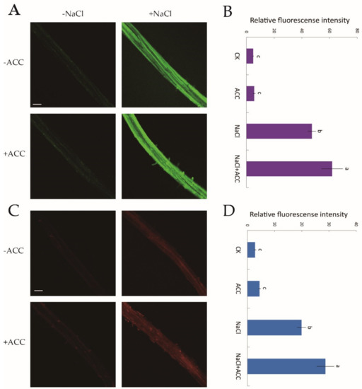 There is a cytosolic H2O2 and Ca2+ burst when plants are subjected to NaCl treatment [10]. However, whether ethylene upregulates H2O2 and [Ca2+]cyt levels under salt stress requires confirmation. Hence, we used two specific fluorescent probes, H2DCF-DA and Rhod-2 AM, for the detection of cytosolic H2O2 and Ca2+, respectively. Confocal assays showed that under no-salt conditions, ethylene had little influence on H2O2 and [Ca2+]cyt fluorescence (Figure 6A–D). However, the fluorescence intensity of NaCl-induced H2O2 and [Ca2+]cyt was significantly boosted (by 31–44%) compared to control samples after exogenous ACC (10 μM, 30 min) shock (Figure 6B,D). The above results suggested that, under salinity stress, ethylene helped to mediate ROS and cytosolic Ca2+ signaling cascades.