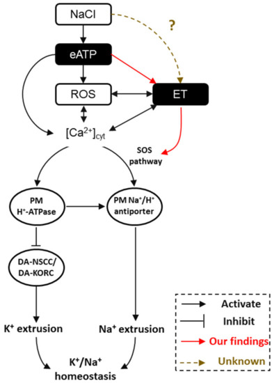 Our findings suggested that in salt-treated Arabidopsis, ethylene significantly assists in maintaining K+/Na+ homeostasis via activation of the PM Na+/H+ antiport system (Na+/H+ antiporters and H+-ATPase), including by enhancing Na+ extrusion, restricting K+ leakage, and upregulating the expression of AtSOS1 and AtAHA1. Moreover, NaCl-induced ethylene is triggered by eATP, which then mediates downstream signaling cascades, e.g., H2O2 and cytosolic Ca2+, and finally interacts with these signaling molecules to ultimately activate the PM Na+/H+ antiport system (Na+/H+ antiporters and H+-ATPase) in response to salt adversity.