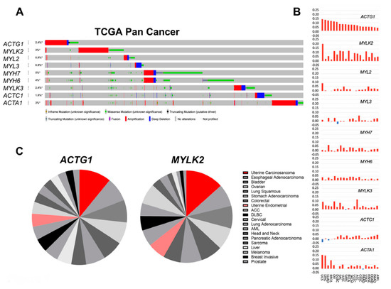 Actomyosin genes regulate a variety of intracellular functions, including cell migration and adhesion, intracellular transport, and signal transduction. While dysregulation of actomyosin genes is associated with diseases including cardiomyopathies [1,2,3,4,5], tumor-associated functions of actomyosin genes have been demonstrated in cancer models including colorectal, prostate, breast, ovarian, melanoma, pancreatic, and others [6,7,8]. In addition, recent studies indicate some actomyosin genes are potential target genes in metastatic cancers [9]. Functionally, mechanotransduction through actomyosin protein functions are key features of highly proliferative tumor cells, and their regulatory signaling pathways, such as RAS or G-protein coupled signaling, are indeed pro-tumorigenic [10,11,12]. In addition to modulating tensile stress, the actomyosin proteins are also signaling effectors in cell division, epithelial to mesenchymal transition (EMT), and cell motility [13,14]. While these intracellular functions are key to the maintenance of individual tumor cells, actomyosin proteins also dynamically regulate interactions with neighboring cells, the extracellular matrix, or additional factors in the tumor microenvironment [10,11,12]. Although these protein functions are well documented in the context of cancer biology, it is less apparent which cancer lineages have the greatest tendencies of dysregulating actomyosin protein functions and how clinical endpoints such as tumor progression or overall survival are impacted by these alterations in patients.