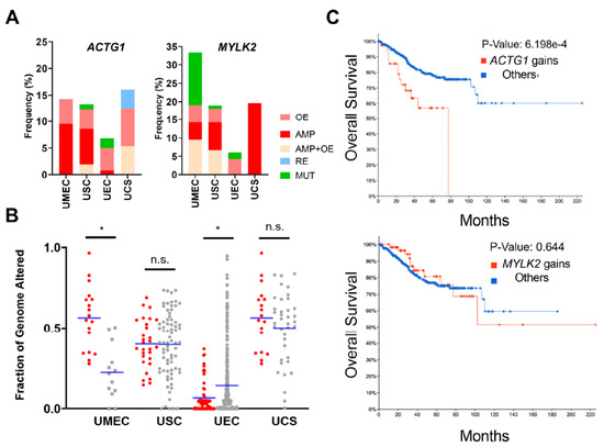 Given that ACTG1 and MYLK2 showed the greatest alteration frequency in uterine cancer, we sought to explore them further within uterine cancer subtypes. ACTG1 and MYLK2 were gained (amplified and/or overexpressed) at 5~14% and 5~20%, respectively, in uterine mixed endometrial carcinoma (UMEC), uterine serous carcinoma (USC), uterine endometrioid carcinoma (UEC) and uterine carcinosarcoma (UCS) (Figure 2A). To determine potential mechanisms of ACTG1 and MYLK2 gains, we also examined genomic instability through measurements of fraction of the genome altered (FGA) in uterine cancers with and without ACTG1 and MYLK2 gains. USC and UCS did not have a statistically significant difference between the two groups, indicating that the ACTG1 and MYLK2 dysregulation in those tumors was not driven by genomic instability (Figure 2B). However, in UEC, these gains were associated with statistically significantly lower rates of FGA, whereas in UMEC, we observed higher FGA. Overall, we found no consistent relationship between ACTG1 and MYLK2 dysregulation and FGA, indicating that these events were likely not reflective of overall genomic instability.