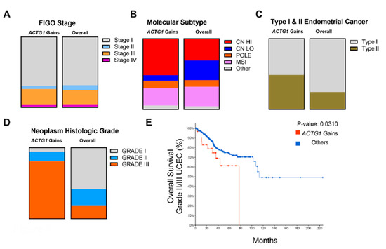 Given that ACTG1 gains were associated with worse prognosis, we sought to further explore the genetic interactions of ACTG1 based on known classifications of UCEC including FIGO Stage, histological grade, molecular subtypes, and tumor type [21,22]. We did not find a significant difference between the percentage of cases across the FIGO stage with ACTG1 gains vs. overall cases (Figure 3A). Next, we examined the molecular subtypes associated with endometrial carcinomas. TCGA classified UCECs into the POLE ultra-mutated, microsatellite instability (MSI), copy number low and copy number high groups [21,22]. ACTG1 gains were enriched in the population of copy number high tumors but reduced in the copy number low tumors (Figure 3B). This is consistent with our finding that many cases harbored ACTG1 copy number gains (Figure 2A). We also examined ACTG1 gains with consideration of type I vs. type II endometrial cancers. We found that ACTG1 gains were slightly enriched in type II endometrial cancers (Figure 3C). Moreover, while we further looked at ACTG1 gains among tumors with distinct histologic grades, we found ACTG1 gains in greater proportion in grade III neoplasms and had reduced representation in grade I neoplasms (Figure 3D). As grade 1 tumors have an exceptional prognosis, they were excluded from survival analysis to enrich for clinical events relevant to ACTG1 gains. ACTG1 gains remained prognostic for grade II/III tumors (Figure 3, p = 0.031). Together, this data suggests that while ACTG1 gains occur more commonly in higher grade uterine cancers, they nonetheless remain prognostic for overall survival in this cohort. (Figure 3E). Overall, ACTG1 gains were not limited to specific UCEC clinical characteristics. In addition, the enrichment of ACTG1 gains in high-grade tumors specified a group of patients with even worse prognosis.