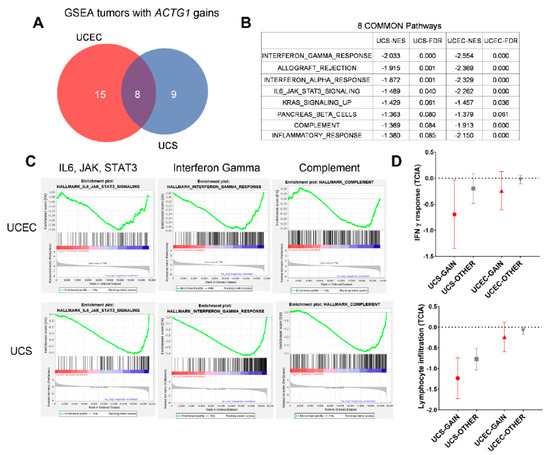 UCEC and UCS with ACTG1 gains are associated with a reduction in an interferon gamma response (IFN-γ) response. (A) Venn diagram represents GSEA analysis of UCEC and UCS with ACTG1 gains from TCGA, with the numbers representing statistically significant gene sets (FDR < 0.1) (B) 8 gene programs are consistently enriched in UCEC and UCS with ACTG1 gains. The net enrichment scores (NES) and false discovery rates (FDR) are shown. (C) Enrichment plots of ACTG1 in UCS and UCEC cohorts show de-enrichment in interleukin-6 (IL6) and IFN-γ. (D) Based on aggregating TCIA data, the IFN-γ response and lymphocyte infiltration tumors examined within the UCS and UCEC cohorts and grouped by ACTG1 gain (red) and without (grey). The mean response is shown as well as a 95% confidence interval (CI). A p-value of less than 0.1 was considered significant.