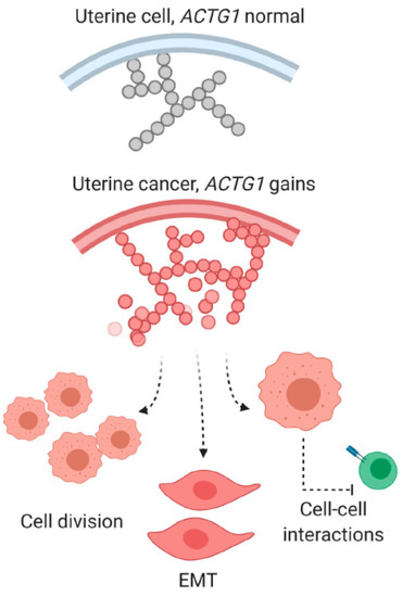 ACTG1 function and consequences of its gains are depicted in uterine cancers subtypes.