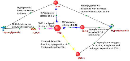 Figure 2 shows the network of interactions between the THBS1 and GV-related genes. It was demonstrated that THBS1 is able to bind to CD36, a transporter and sensor of free fatty acids. Binding of CD36 to THBS1 initiates anti-angiogenic signals, induction of endothelial cell apoptosis, and the inhibition of angiogenesis [74]. THBS1 differentially regulates the release of IL-6 and IL-10 by human monocytes [75]. Both hypoglycemia and hyperglycemia increased serum concentrations of IL-6 [76,77], while hyperglycemia down-regulated IL-10 mRNA levels [78]. THBS1 modulates epidermal growth factor 1 (EGR1) function [79]. At the same time, up-regulation of THBS1 is mediated by EGR1 [80]. Hyperglycemia is responsible for EGR1 activation, acetylation, and its prolonged expression [81].