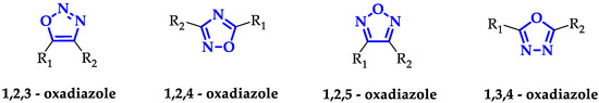 Their aromatic flat surface is effective in the target binding, through π-stacking interactions, or to properly outdistance the substituents according to a specific orientation [7]. Depending on nitrogen atoms position, oxadiazoles exist in four different regioisomeric forms (Figure 1): 1,2,3-, 1,2,4-, 1,2,5-, and 1,3,4-oxadiazoles.
