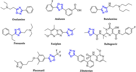 During the last decades, the design of new oxadiazole-based scaffolds accelerated in medicinal chemistry, bringing most of these compounds to the preclinical stage or, even, to commercialization. Among these, the most commercially available drugs are Oxolamine, a cough suppressant [16], Ataluren, indicated for the treatment of Duchenne muscular dystrophy [17] and cystic fibrosis [18], Butalamine, a vasodilator, Proxazole, a drug for functional gastrointestinal disorders, Fasiplon, an anxiolytic drug [19], Raltegravir, an antiretroviral drug used to treat HIV [20], which has been recently proposed as repurposing drug against SARS-COV-2 [21], as well as the antiviral Pleconaril selected for the SARS-COV-2 spike protein [22] (Figure 2). Equally well known is Zibotentan, an anticancer drug in late-stage clinical trials (www.ClinicalTrials.gov Identifier: NCT00554229), which is a candidate in development by AstraZeneca (Figure 2).