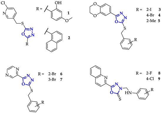 Chemical structures of oxadiazole scaffolds involved in different enzyme binding.