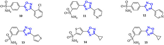 Krasavin et al. synthesized, in 2018, a promising series of CA inhibitors based on primary sulfonamide-tagged 1,2,4-oxadiazole core. Through CO2 hydration stopped-flow biochemical assay, they compared the ligands interactions with two cytosolic CA isoforms (I and II) and two membrane-bound CA (IV and IX) [33]. Several of these compounds revealed a marked selectivity in CA II and CA IX inhibition, classical targets for treatment of glaucoma-related intraocular hypertension and solid tumors, respectively. Nineteen compounds inhibited CA II in a sub-nanomolar range, among which 10 (Figure 4) shown the best Ki value equal to 0.48 nM, twenty-five times lower than positive control acetazolamide (12.1 nM). CA IX inhibition was reached at low-nanomolar range by fourteen compounds, with the best result derived from 11 (Ki = 1.2 nM; Figure 4) significantly lower than Acetazolamide (25.8 nM) [33]. Despite the fact that these compounds did not show a univocal selectivity, the cellular localization of CA II and CA IX is so different that it was not a real disadvantage. Docking studies predicted that 1,2,4-oxadiazole unit was not involved in crucial direct interaction with the targets, except for the possible presence of H-bond with Gln92. Anyhow, it properly orients its substituents allowing them specific interactions with the targets.
