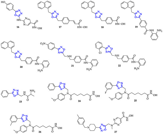 In general, the pharmacophore model of an HDAC inhibitor is constituted of three different parts: a binder of Zn2+ ion, a linker region to accommodate the Zn-coordinator into the catalytic binding site of HDAC and a cap group used as selective vector. Rajak et al. synthesized hydroxamic acids, containing 2,5-disubstituted 1,3,4-oxadiazole as surface recognition cap group, which resulted in a moderate anticancer activity due to specific HDAC1 inhibition [38]. In particular, 16 (Figure 5) displayed an inhibitory activity against HDAC1 (IC50 = 0.017 µM) at least equal to positive control Trichostatin A (IC50 = 0.016 µM) and an IC50 of 0.28 µM against human colon cancer cell (HCT-116) proliferation. Moreover, testing its activity in vivo against Ehrlich ascites carcinoma cells in Swiss albino mice, they measured 85.7% inhibition of Ascitic fluid and 77.7% of Ascitic cell, using Mitomycin-C as standard [38].