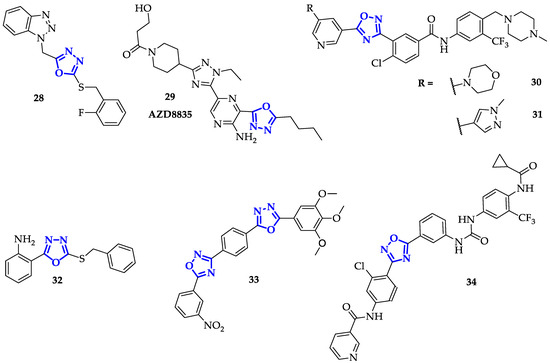 Another interesting kinase target is a group of lipid kinases, PI3Ks, whose biological activity resulted in protein kinase B (AKT) recruitment inducing a cascade of cell signaling. Barlaam et al. optimized kinase-specific selectivity of a potent PI3Ks inhibitor developing a family of twenty-five 1,3,4-oxadiazoles derivatives [48]. Among them, the authors revealed the outstanding compound 29, known as AZD8835 (Figure 6), able to inhibit cancer progression by blocking the PI3K pathway components PI3Kα and β. It reached the phase I clinical trials sponsored by AstraZeneca (www.ClinicalTrials.gov Identifier: NCT02260661) to evaluate its safety and pharmacokinetics in patients with advanced solid tumors. Compounds 29 displayed superior potency and selectivity toward PI3Kα (IC50 = 10 nM) with good metabolic stability. A competitive selectivity was confirmed only with BMPR1B enzyme (Kd value of 12 nM versus 2.3 nM for wild type PI3Kα) and PI4Kα and PI4Kβ (more than 50-fold selectivity margin versus PI3Kα) outside PI3K class I enzymes. Moreover, 29 resulted to be able to specifically interact also with mutated PI3Kα enzymes (E542K, E545K, H1047R) aside from wild type PI3Kα, with the same range of Kd values [48]. The potency of 29 in enzyme inhibition was common for all class I PI3K enzymes: IC50 values in the nanomolar range for PI3Kδ and PI3Kα (wild type and mutated), one order of magnitude higher against PI3Kγ and two order against PI3Kβ. In cell-based assay, testing the ability in AKT phosphorylation inhibition, it has been discovered that 29 affected cells sensitive to PI3Kα (IC50 = 0.057 µM in BT474 cells) and PI3Kδ (IC50 = 0.049 µM in Jeko-1 B cells). Because of its good solubility and permeability, as well as low turnover in hepatocytes, the effects of 29 on AKT phosphorylation (at Ser473 residue) were followed in nude mice bearing mutant H1047R PI3Kα SKOV-3 tumor xenografts. Significant inhibition was only seen at 25 mg/kg dose, in accordance with the lower plasma concentrations after 8 h from the administration. Anyhow, in the same model, almost complete inhibition of tumor growth (93%) was measured after chronic oral administration [48].