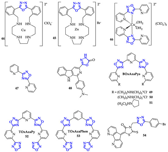 Terenzi et al. taking inspiration from platinum-based chemotherapeutic compounds, synthesized two new oxadiazole metal complexes, 44 and 45 (Figure 9), able to bind DNA both by metal coordination and through intercalation of the aromatic fragments [75]. The presence of a positive charge on the metal complex enhanced the electrostatic interactions between ligands and targets, while the labile ligand with counterion can be easily substituted by a nitrogen heterocyclic atom of a DNA base forming a covalent binding. The preliminary biophysical analysis confirmed the interaction with calf thymus DNA: both zinc and copper metal complexes (44 and 45) determined the increase of the DNA melting temperature, the perturbation of DNA circular dichroism signal and good values of intrinsic binding constants, equal to (6.7 ± 0.5) × 106 M−1 and (4.7 ± 0.5) × 105 M−1 respectively. These complexes were not able to cross the cellular membrane, so biological tests were performed using a lipid carrier (Lipofectamine 2000) for internalization. The analysis led on MDA-MB231 cell line showed a good activity especially for 45 with an IC50 value of 100 µM. Compound 45 reduced the cell survival in a dose-dependent manner and significantly perturbed their cell cycle profile [75].