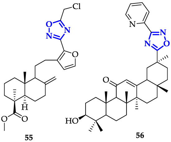 Modification of oxadiazole scaffolds through conjugation to bioactive natural products also represents a promising approach. Mironov et al. exploited Furano-diterpenoids of the labdane series, an anti-inflammatory and anti-allergic drug-like [90], to build novel and potent derivatives [91]. In detail, 1,2,4-oxadiazoles were conjugated to labda-8(9),13,15-triene or labda-8(17),13,15-triene core and their antiproliferative activity and GI50 on CEM-13, MT-4 and U937 cells were measured [91]. From this screening, compound 55 (Figure 10) emerged for its remarkable toxicity, with GI50 values of 0.08 ± 0.03 µM on CEM-13, and 0.35 ± 0.11 µM on MT-4. Moreover, cytofluorimetric analysis demonstrated that treatment of U937 cells with 55 induced apoptosis in 46.8% of cells after 24 h and 84.4% after 48 h [91].