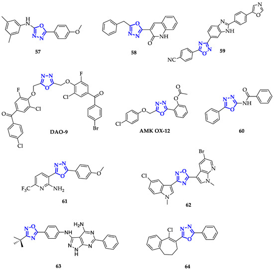 Modification of the 1,3,4-oxadiazole scaffold with only two phenyl rings resulted to be a successful strategy also for Mochona et al., that individuated compound 60 (Figure 11) as the best of the series with the highest toxicity in particular on PC-3 cells (IC50 = 0.22 µM) [101]. Subsequently, it has been verified that 60 induced apoptosis and cell cycle arrest at G0/G1 and S phases.