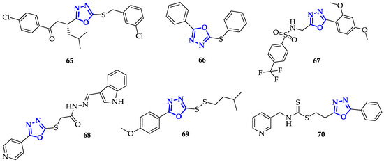 The presence of an aromatic system is not the only important structural feature: it has been discovered that also oxadiazoles conjugating to sulfur atoms present interesting biological properties. Guogang et al. obtained promising results after the synthesis of a library of 1,2,4-triazoles and 1,3,4-oxadiazoles, including a series of 5-thioxo-1,3,4-oxadiazole analogs, differing for the kind of phenyl substituent and the type of thio-derivative introduced on the lateral chain in position 5 [106]. Comparing 1,2,4-triazoles and 1,3,4-oxadiazole analogs, 1,2,4-triazoles have lower toxicity. Indeed, the highest antiproliferative activity was recorded by 65 (Figure 12) on K562 cells, showing an 85% inhibition ratio [106].