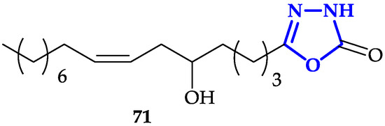 - Hassan, M.F.; Rauf, A.; Sherwani, A.; Owais, M. Synthesis and In Vitro Biological Evaluation of 1,3,4-Oxadiazol-2(3H)-one and Tetrahydropyridazine-3,6-dione Derivatives of Fatty Acids. Sci. Pharm. 2015, 83, 429–443. [Google Scholar] [CrossRef] [PubMed][Green Version]