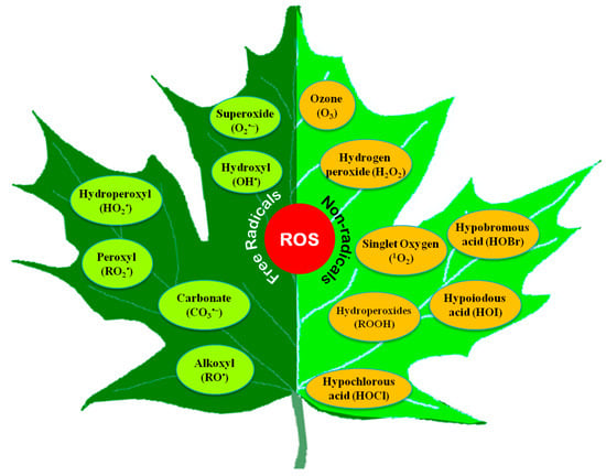 Both free radical and non-radical ROS are produced in cells (Figure 1). Among them, O2•−, OH•, alkoxyl radical (RO•), and peroxyl radical (ROO•) are the free radicals, while H2O2 and 1O2 are the non-radicals [15]. Some other non-radical ROS, such as hypochlorous acid (HOCl), and excited carbonyl (RO*), are also found in plants [16]. Moreover, some acidic compounds (hypochlorous acid, HOCl; hypoiodous acid, HOI; and hypobromous acid, HOBr) and some radical compounds like carbonate (CO3•−) are also incorporated into ROS [17].