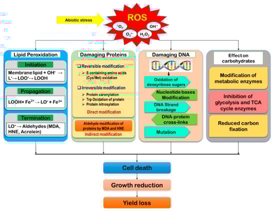 As the by-products of aerobic metabolism, ROS are found to generate naturally in plants. However, when exposed to a stressful environment, the over-generation of ROS disrupts the equilibrium between ROS accumulation and scavenging, causing oxidative damage of biomolecules that cause cellular damage and death [16,46]. Under oxidative stress, biomolecules like lipids, proteins, DNA, carbohydrates, polynucleic acids, et cetera, become reversibly or irreversibly modified (Figure 3).