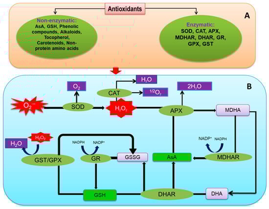 The existence of aerobic organisms, such as plants, depends on oxygen for energy generation systems. Moreover, plants also produce O2 during the photosynthesis. Molecular oxygen could be excited, forming reactive oxygen species (ROS). This ROS includes singlet oxygen (1O2), superoxide radical (O2•−), hydroxyl radical (•OH), and hydrogen peroxide (H2O2) [5,6]. The generation of toxic ROS as a by-product occurs in various cellular sites, such as mitochondria, chloroplast, peroxisome, and apoplast [7]. Under normal conditions, a balance exists between the production and scavenging of ROS by the coordinated action of antioxidant defense system components within the plants [8]. The generation of ROS at a lower level during normal growing conditions takes part in crucial intra- and inter-cellular signaling processes for inducing a positive response in antioxidant defense systems and the biological processes such as cellular proliferation, differentiation, or stress adaptation mechanisms [5].