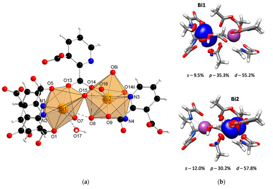 (a) The molecular structure with an atom numbering scheme of complex 1 (Symmetry codes: (i) −x, 1 − y, 1 − z; (ii) 1 − x, 1 − y, 1 − z) (Bi—orange, O—red, N—blue, C—black, H—white); (b) graphical representation of selected molecular orbital localized on Bi atom in complex 1 (DFT calculations).