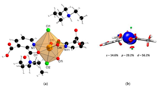 Additionally, the DFT calculations indicated the conclusion from structural studies. There was a smaller contribution of the p orbital (29.2%) and a slightly larger contribution of the s orbital (14.6%) to the localization of the lone electron pair in the Bi(III) center of compound 2 (Figure 2b) compared with the Bi(III) centers of compound 1. As a result, the electron density was more centered and insignificantly influenced the structure distortion.