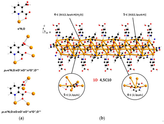 (a) Coordination modes of carboxylate ligands in complex 1; (b) a fragment of the 1D crystal structure merged with 4,5C10 underlying net in valence-bonded MOFs standard representation for coordination polymer 1 (Bi—orange, O—red, N—blue, C—black, H—white).