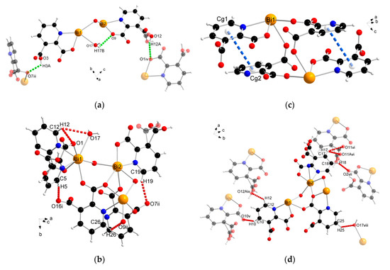 The geometry of noncovalent interactions in complex 1: (a) O–H···O, (b) C–H···O intramolecular, (c) π···π and (d) C–H···O intermolecular (translucent molecules belong to adjacent chains) (Bi—orange, O—red, N—blue, C—black, H—white).