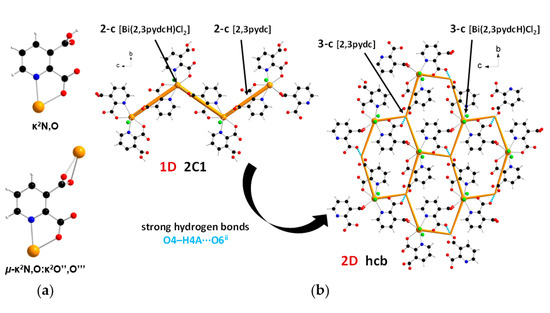 In the structure of complex 2, ligand 2,3pydcH exhibited a chelating coordination mode (κ2N,O), while ligand 2,3pydc exhibited a chelating-bridging coordination mode (µ-κ2N,O:κ2O″,O‴) (Figure 5a). Compound 2 was a 1-dimensional coordination polymer forming a zig-zag pattern along the c axis. From the topological point of view, this type of connection is described as 2C1 in the valence-bonded MOFs standard representation. 2-Connected [Bi(2,3pydcH)Cl2] nodes were combined by 2-connected [2,3pydc] linkers at a distance of 8.909 Å. In the H-bonded MOFs standard representation, the topology of complex 2 was changed. Taking into account the strong O4–H4A∙∙∙O6ii hydrogen bonds formed between the –COOH group of the 2,3pydcH ligand and the –COO– group of the 2,3pydc ligand, the dimensionality increased to 2D (bc plane). Nodes and linkers became 3-connected, which resulted in the formation of a honeycomb-like hcb net described by the 63 point symbol (Figure 5b).