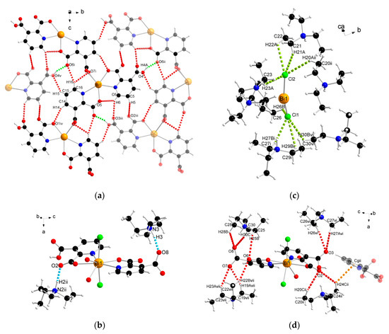 The geometry of noncovalent interactions in complex 2: (a) O/C–H···O formed between adjacent polymeric chains, (b) N–H···O, (c) C–H···Cl and (d) C–H···O/π formed between Et3NH cations and polymeric chains (translucent molecules belong to adjacent chains) (Bi—orange, O—red, N—blue, Cl—green, C—black, H—white).