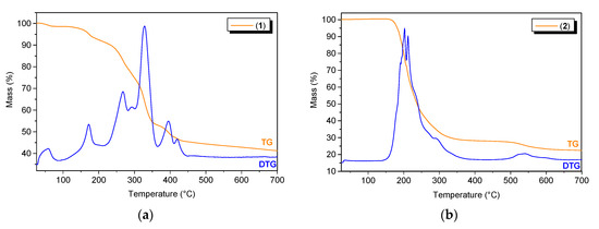 The TG/DTG curves for (a) compound 1 and (b) compound 2.