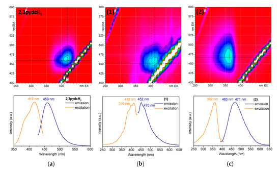 To establish the photoluminescence properties of the newly obtained Bi(III) coordination polymers 1 and 2, 3D and 2D room temperature solid-state excitation/emission spectra were recorded (Figure 9). Pyridine-2,3-dicarboxylic acid exhibited blue light emission with a maximum at 459 nm after excitation at 419 nm (Figure 9a). The emission of the ligand was attributed to the intraligand (IL) n→π* transitions [63]. The excitation spectrum of 2,3pydcH2 contained an additional band without a distinct maximum below 400 nm, which was attributed to the higher energy π→π* transitions. Comparing the 3D spectrum of compound 1 (Figure 9b) with the 2,3pydcH2 spectrum, the emission centers were located at similar wavelengths. The emission maximum at 452 nm (λex = 413 nm) was only slightly blue-shifted (7 nm) in the spectrum of complex 1 compared to the ligand. The emission band was characterized by a similar ligand Stokes shift (39 nm), which pointed to the intraligand type of electronic transitions in complex 1. The shoulder at ca. 470 nm indicated the presence of two types of ligand in the structure (mono-deprotonated and fully deprotonated), which coordinated to Bi(III) ions in different fashions. Thus, constructed in this way, the polymeric structure is characterized by a different rigidity, which influences the energy of emission. Similarly, compound 2 exhibited blue luminescence with a maximum at 463 and 471 nm after excitation at 362 nm (Figure 9c). Moreover, a significant Stokes shifts (101 and 109 nm) of coordination polymer 2, accompanying by similar excitation wavelength compared to the ligand, suggested that the emission of 2 can be attributed to a ligand-to-metal charge transfer transition (LMCT), as well as to a change in the intraligand transitions (IL) [27,32,64]. The photoluminescence quantum yield of complex 2 was 8.36%, which makes it a good candidate for more specific studies of Bi-based fluorescent materials [62,65].
