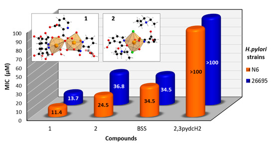 An analysis of the obtained results (Figure 11) revealed that the ligand 2,3pydcH2 was inactive against both H. pylori strains (26695 and N6), even at high concentrations (MIC > 100 μM). Both Bi(III) complexes exhibited bacteriostatic effects towards H. pylori. The MIC values of 1 and 2 towards reference strain 26695 reached values of 13.7 and 36.8 μM, respectively. The results indicated that the compound 1 was about twice as potent against H. pylori than the commercially used Bi-based drug BSS (MIC = 34.5 μM). Moreover, strain N6 was slightly more sensitive to compound 1 (MIC = 11.4 μM) and compound 2 (MIC = 24.5 μM) than strain 26695. Generally, compound 1 was more than twice as active against H. pylori as compound 2. It can be concluded that the presence of chloride and triethylammonium ions in the structure of complex 2 pointed out the anionic form of Bi(III) complex, which influenced its antibacterial activity. The anionic form of complex 2 is more difficult to penetrate the negatively charged cell membrane of the H. pylori bacteria.