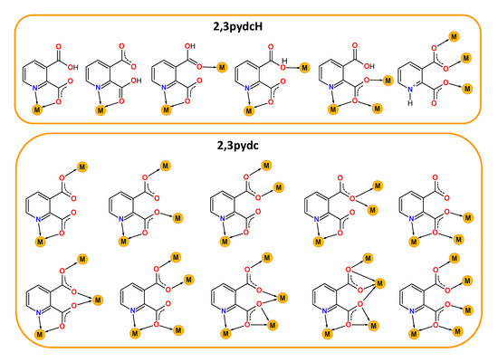 Selected coordination modes of mono-deprotonated-2,3pydcH (top) and deprotonated-2,3pydc (bottom) forms of pyridine-2,3-dicarboxylic acid (2,3pydcH2) in coordination with different metal ions reported in the literature [43,44,45,46,47,48,49,50,51,52,53,54,55].