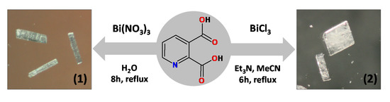 Chemical reagents were purchased commercially and used as received without further purification; Bi(NO3)3∙5H2O (POCH S.A., Gliwice, Poland), BiCl3 (Sigma-Aldrich, Steinheim, Germany), pyridine-2,3-dicarboxylic acid (Sigma-Aldrich, Steinheim, Germany), triethylamine (POCH S.A., Gliwice, Poland) and all organic solvents (Chempur, Piekary Śląskie, Poland). Elemental analysis (CHNS) was performed on an Elementar Vario Micro Cube analyzer (Elementar, Langenselbold, Germany). FT-IR spectra were recorded on a Nicolet 380 FT-IR type spectrophotometer (Thermo Scientific, Waltham, MA, USA), in the spectral range 4000–500 cm−1, using the ATR-diffusive reflection method. The thermal analysis (TG/DTG) was carried out using a TG/SDTA 851e Mettler-Toledo thermobalance (Columbus, OH, USA). The experiments were performed in air atmosphere, at a heating rate of 5 °C min−1, in the temperature range of 25–700 °C, using α-Al2O3 crucible.