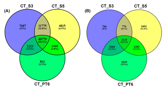 The transcriptome assemblies based on the reference-genome after mapping filtered reads to the N. tabacum reference genome predicted 64,033, 60,597, and 46,640 genes in the CT_S3, CT_S5, and CT_PT6 stages, respectively, suggesting the diminution of the transcriptome during the progression of male gametophyte development. Among them, 40,779 genes were expressed in all three stages (Figure 1A).