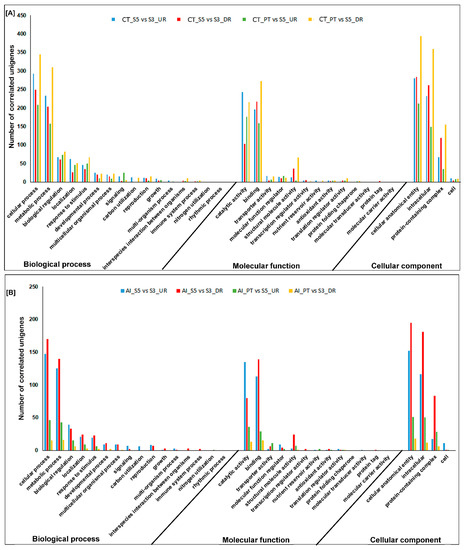 Figure 2. Histogram of Gene Ontology (GO) classification of correlated differentially expressed mRNAs/differentially expressed proteins (DEGs/DEPs) in stage-specific comparison in control (A) and AFCVd-infected (B) pollen. The results are summarized in three main categories: biological process, cellular component, and molecular function. The x-axis indicates subcategories; right y-axis indicates number of genes in a category. UR: upregulated, DR: downregulated.