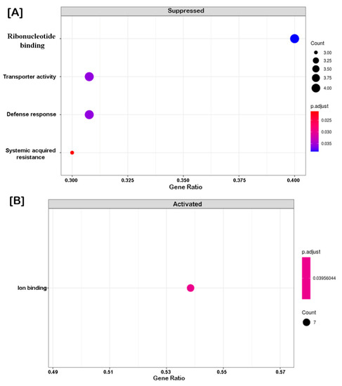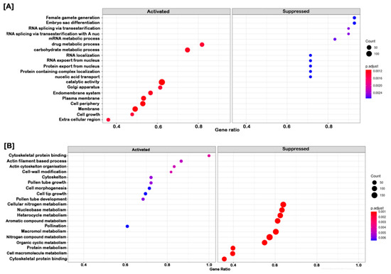Figure 4. GO functional enrichment analysis of correlated DEGs/DEPs in pairwise comparisons of S5 vs. S3 (A) and PT6 vs. S5 (B) of AFCVd-infected male gametophyte of tobacco. The y-axis indicates gene functions, and the x-axis indicates gene ratios. The size of dots represents the degree of enrichment and their color indicates the degree of statistical significance.