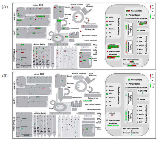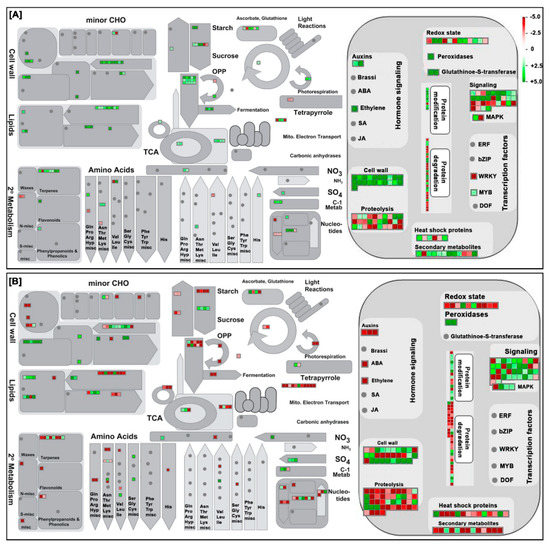 Figure 6. Overview of the MapMan visualization of correlated DEGs/DEPs in pairwise comparison of S5 vs. S3 (A) and PT6 vs. S5 (B) of AFCVd-infected male gametophyte of tobacco. The log2 fold changes of significantly cor-DEGs/DEPs were imported and visualized in MapMan. Signals colored red and green represent a decrease or increase in transcript abundance in the pairwise comparison sets of three AFCVd-infected stages. The scale used for coloration of the signals (log2 ratios) is shown on the top right.