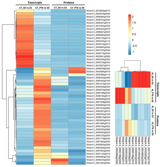 Figure 7. Cluster analysis of associated correlated DEGs/DEPs at transcript and protein levels in pairwise comparison of control and AFCVd (AI) samples of S3, S5, and PT6. Each row in the graph represents a protein/mRNA, and each column in the graph represents the log2 transformed average FPKM value of DEGs of two biological replicates (n = 2) and log2 transformed average iTRAQ value of corresponding DEPs of three biological replicates (n = 3). Expression differences are shown in different colors; red indicates up-regulation, while blue indicates down-regulation. The color scale of the heat map ranges from saturated blue (value, −2.0) to saturated red (value, 2.0) in the natural logarithmic scale.