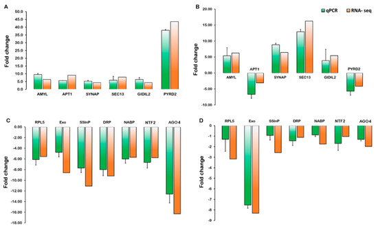 Figure 8. Validation of expression patterns of differentially expressed genes by RT-qPCR. Graph showing fold change of gene expression in pairwise comparison of stage 5 vs. stage 3 (A) and stage PT6 vs. stage 5 (B) of three developmental stages of control and stage 5 vs. stage 3 (C) and stage PT6 vs. stage 5 (D) of AFCVd-infected three developmental stages of male gametophyte of tobacco. AMYL: alpha-amylase; APT1: aberrant pollen transmission 1; SYNAP: synaptotagmin C2 membrane targeting protein; SEC13: protein transport SEC13-like protein; GID1L2: gibberellin receptor; PYRD2: pyruvate decarboxylase 2; RPL5: 50S Ribosomal protein L5; EXO: RNA exonuclease; SSInP: single-stranded-interacting protein 1; DRP: DNA-directed RNA polymerase; NABP: nucleic acid binding protein-K Homology domain; NTF2: nuclear transport factor 2; AGO4: argonaute 4-like protein. The qRT-PCR data (green bars) are expressed as the mean values of three experimental replicates from three independent experiments, with error bars depicting the standard error. The RNA-seq data (orange bars) are also shown for comparison.