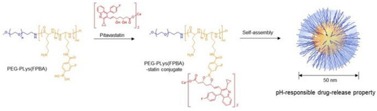 Schematic illustration of block-copolymer (blue = poly(ethylene glycol) segment, yellow = poly(l-lysine)-phenylboronic acid segment) and statin (red)-loaded polymeric micelles.