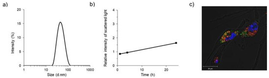 Poly(ethylene glycol)-b-poly(l-lysine) (PEG-PLys) and PEG-PLys(FPBA) were synthesized according to our previous research [20,21], and their characteristics were measured by proton nuclear magnetic resonance (1H-NMR) and gel permeation chromatography (Figures S1–S4). Briefly, PEG-PLys(FPBA) was dissolved into phosphate-buffered saline (PBS) and stirred with pitavastatin/tetrahydrofuran solution. The pitavastatin-loaded polymeric micelle (PS/m) was spontaneously formed upon ultrafiltration with water. In this process, new covalent bonds were formed between the phenylboronic acid on the polymer side-chains and the diol in statin, and then, those polymer–drug conjugates self-assembled to form polymeric micelles (Figure 1). The diameter of the polymeric micelles was approximately 50 nm with symmetric distribution (polydispersity index = 0.12), as determined by a zetasizer (Figure 2a). The micelle was determined to be relatively stable following 24 h incubation under physiological conditions (Figure 2b), indicating the potential for maintaining its micelle structure in the bloodstream.
