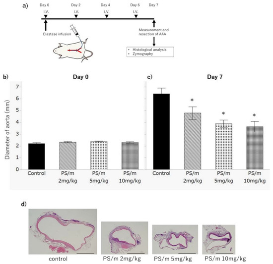 Experimental procedure and abdominal aortic aneurysm (AAA) treatments. (a) Experimental procedure of the elastase infusion model. Elastase infusion into the aorta is performed on day 0. Rats received an intravenous injection of the drug immediately after the operation and on days 2, 4, and 6. On day 7, the diameter of each aorta was measured, and it was resected for analysis. (b,c) Diameter of aortas on initial (day 0) and 7 days from the first administration. Control, PS/m 2 mg/kg, and PS/m 5 mg/kg groups: n = 7. PS/m 10 mg/kg group: n = 3. * p < 0.05. Error bars denote the standard error of the mean. (d) Cross sections of AAAs at 7 days, original magnification ×2. Scale bars: 1 mm.