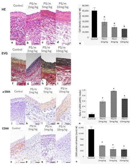 Histological appearance of AAA treated with phosphate-buffered saline (PBS) or PS/m. (a–d) hematoxylin and eosin (HE) stain, (f–i) Elastica van Gieson (EVG) stain, (j–m) α smooth muscle actin (αSMA), (o–r) CD68, original magnification ×40. Scale bar define 20 μm. Treated with PBS are (a,f,j,o); treated with PS/m 2 mg/kg are (b,g,k,p); 5 mg/kg are (c,h,l,q); 10 mg/kg are (d,i,m,r). (e) Cell density of HE stains. (n) Quantitative analysis of αSMA. (s) CD68 positive cell density. Elastic lamina (black in EVG) and αSMA positive cells (brown in αSMA) exist in media of AAAs, which was treated with PS/m groups (g–i,k–m). Abundant infiltrations of CD68 positive cells (brown) are observed in AAA, which was treated with PBS (o). * p < 0.05 compared with the control. Error bars denote the standard error of the mean.